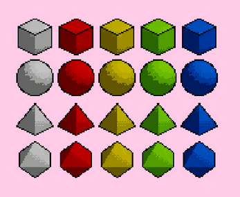 32x32 geometric shape sprites that you can use for your game. It includes a cube, a sphere, a pyramid and a diamond in grey, red, yellow, green and blue respectively.